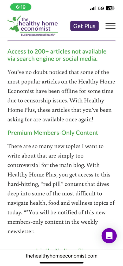 3. Sarah Pope’s Healthy Home Economist Plus Members service. Sarah has been blogging about ancestral foods and holistic healing for 16 years. She has been a chapter leader for the Weston A. Price Foundation so has a deep understanding of real, ancestral foods nutrition. This subscription is $59 a year. Members get access to articles on her blog that aren’t available to the general public, all 4 of her books in ebook format, and access to asking Sarah questions via her live chatbox feature. With a bachelor’s degree in economics and a master’s degree in government administration, and as a mother of 3 children, she shows that she can think critically, all with a mother bear chemistry perspective to uncover all the scams in the holistic health world. Go here to sign up!