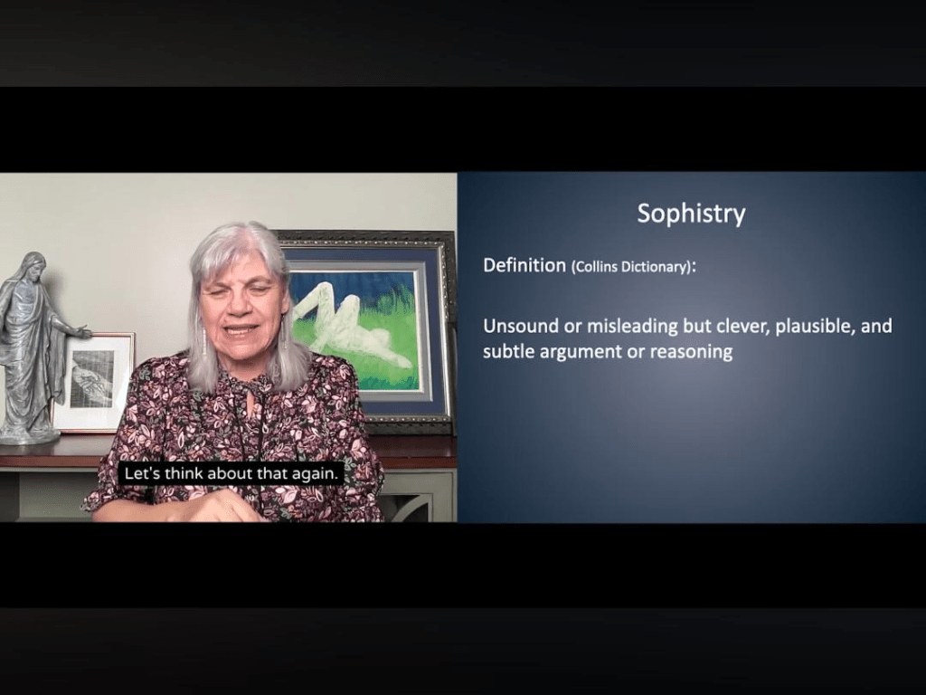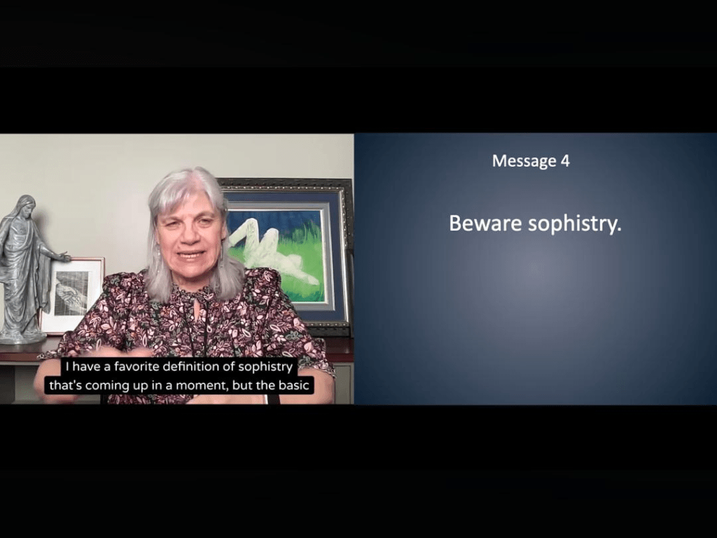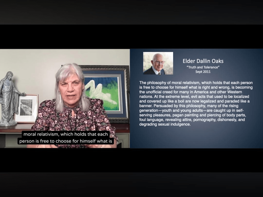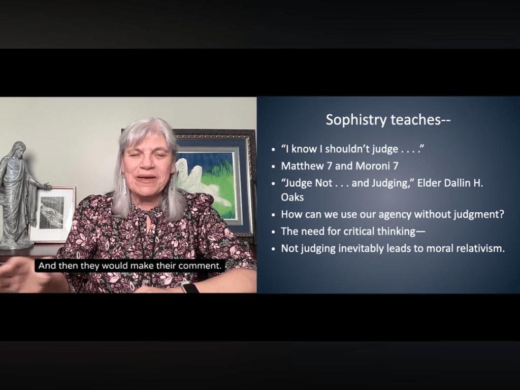 The favorite false doctrine of members of the Church, she says, is “Don’t judge.” She explains that the scripture, Matthew 7:1, has a Joseph Smith Translation footnote that says that what Jesus actually said was, “Judge not unrighteously, that ye be not judged; but judge righteous judgment.” We have to judge righteously to succeed in life. Not judging, as well as judging unrighteously, leads to moral relativism which leads to evil and misery.
