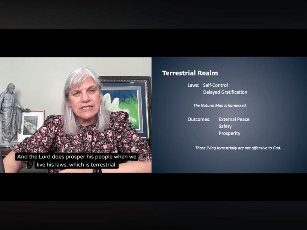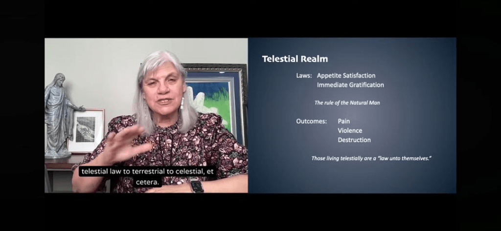 She says when she taught the above message at BYU and then at the Weber State devotional people gasped. The natural reaction is “Shouldn’t we marry a celestial person?” She answers, “Good luck finding a celestial person!” She goes on to say that that is impossible. She says that a temple recommend is the threshold for a person being Terrestrial. It’s not a guarantee but a guide. People don’t always stay on that path because of agency. But generally, they do, with exceptions.