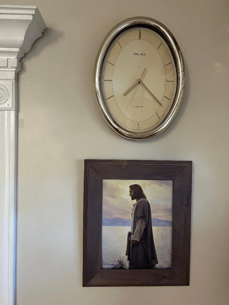 I love it! I’m not sure, however, if the above spot is the final resting place for my new framed work of art. I’m just not sure how I like the curved gold frame of the clock with the heavy gray frame of Jesus and the white trim of the doorway to the left. So, I’m moving this framed art around to see where it looks best. Or maybe I’ll move the clock. Anyway, I love decorating with creativity and frugality! Of course, I’d love to have a million dollars to decorate with as well, but for now I’ll make do with what I have. Maybe I’ll eventually advance to including mats with my framing.