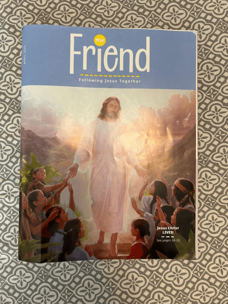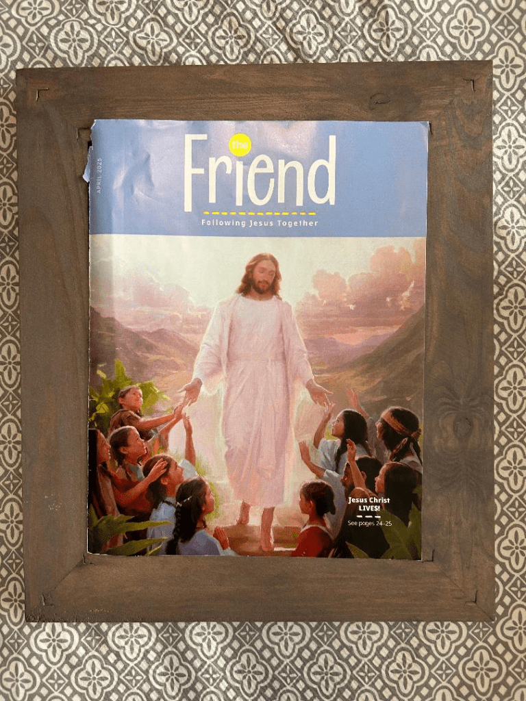 2. Flip through your magazines and find the piece of art in the pages that speaks to your soul, one where you just instantly feel like you have to frame and hang on your wall. In my case, it was this print above of a portrait of Jesus Christ by Greg Olsen. It’s from The Friend, the April 2025 issue, shown below. It’s the inside of the front cover. I guess you could print it from the link I just gave using your computer’s printer if you have a super high-quality printer and plenty of colored ink, if you trust your printer to do a great job.