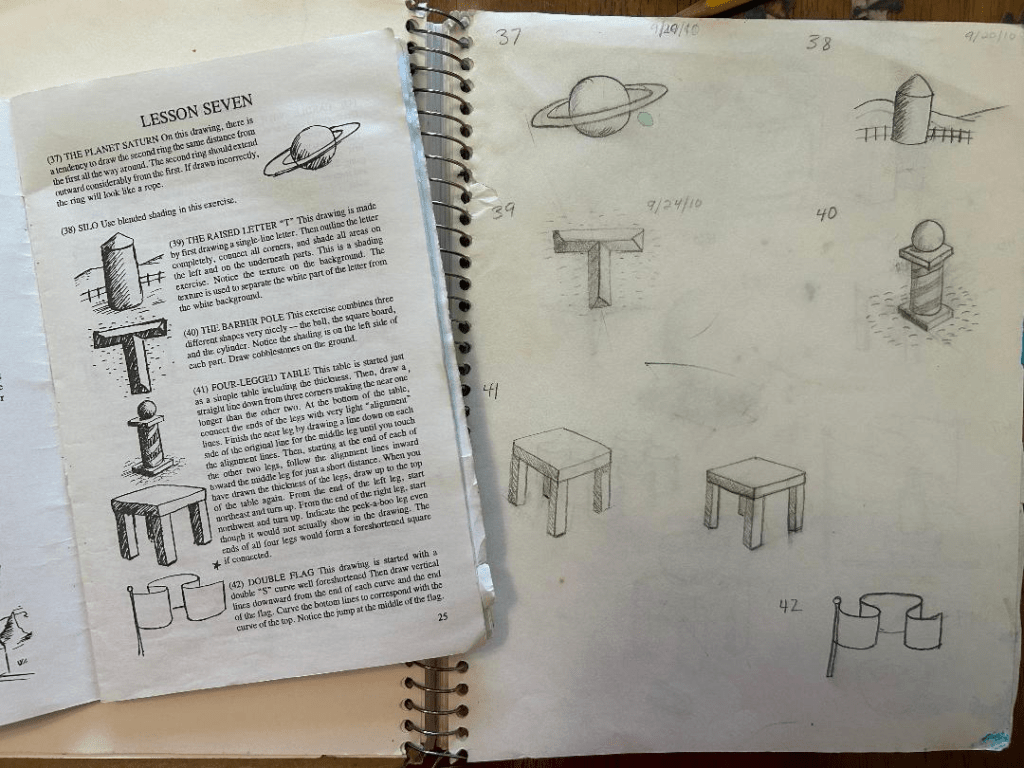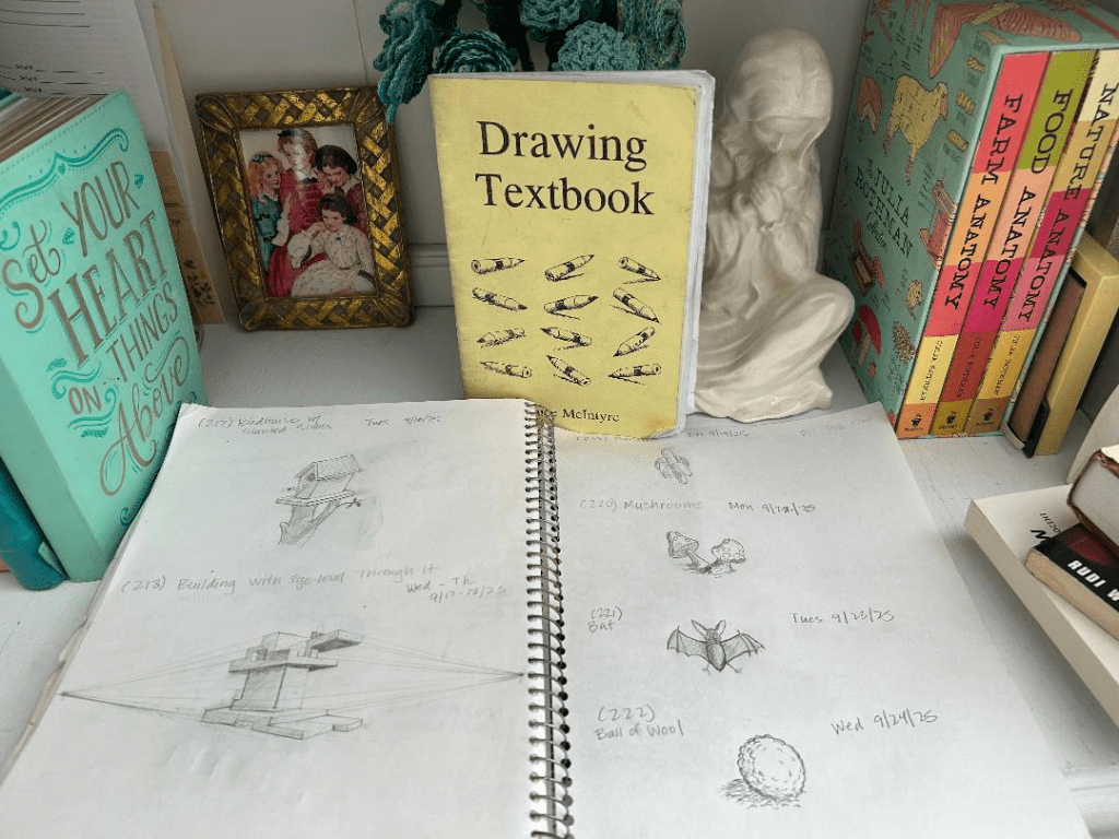 I started this book so long ago, I’m not really sure of the date. At least ten years ago, back in 2015. Probably before. I started using this book when most if not all of my children lived at home, to be used as a homeschooling topic of study to enjoy together. Watching my mom and my sister develop drawing skills always intrigued me. Both studied art in college, with my sister earning a bachelor’s of art degree in illustration. I’ve always wanted to develop my artistic skills but have hardly taken the time, always feeling like I had more urgent things to do. In high school it was to study for and pass 7 AP tests (not art, but art history was one of the AP tests I passed), then in college it was to graduate with a degree in zoology premed emphasis, then it was have a job at a medical school, then after getting married, it was to rear and homeschool seven babies.