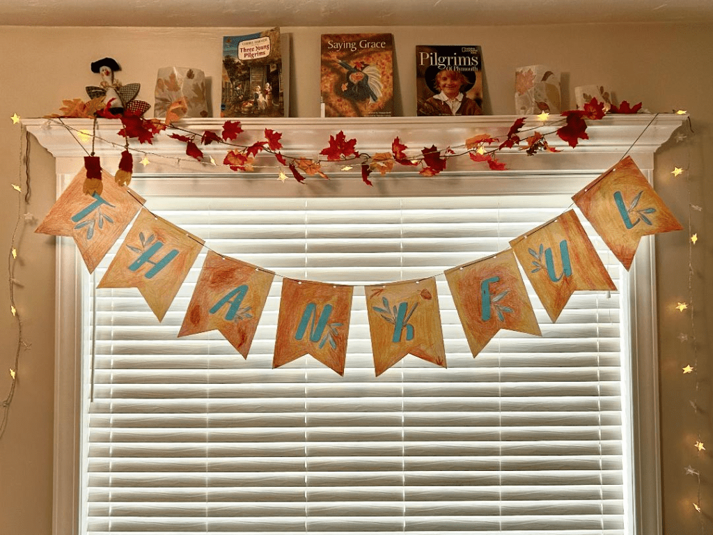 -any kind of free or inexpensive printable banner you can find online, like here and here. I’m not super big into Halloween so I use Thanksgiving-themed banners for my fall decorating