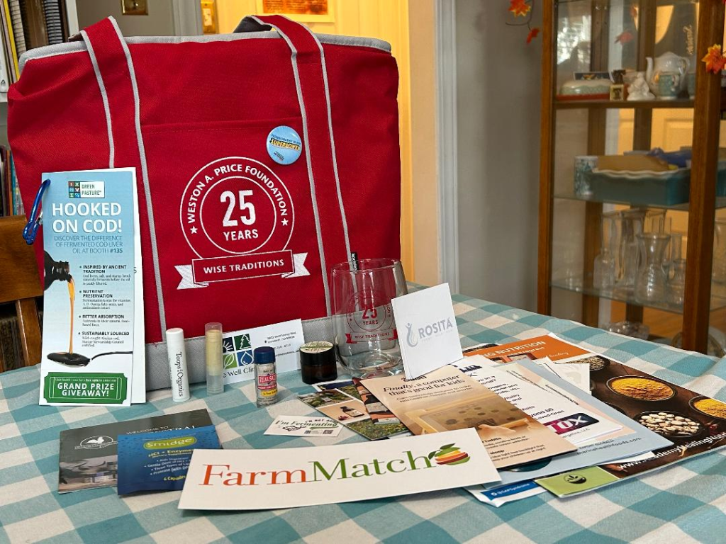 Below is the cool sturdy bag that each participant received along with the conference program, and some of the free vendor samples I received. Each banquet attendee also got a glass with the WAPF 25 years anniversary logo. At the banquet we did a kombucha toast with the glass.