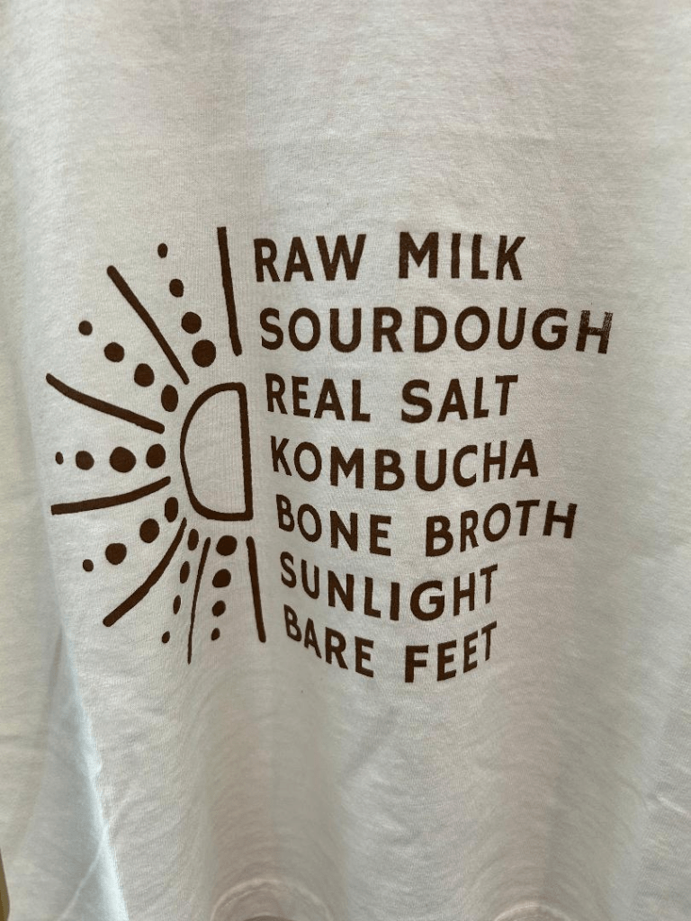 So many interesting natural-health promoting products abounded at the conference. See the stickers above, and below is a T-shirt promoting crunchy mom values. I love it!