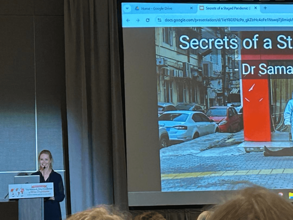 My very favorite talk was by Dr. Samantha Bailey, a medical doctor from New Zealand. She talked about “Secrets of a Staged Pandemic” on Friday night. I remember hearing her in YouTube during the plandemic. She is shown in the photo below.