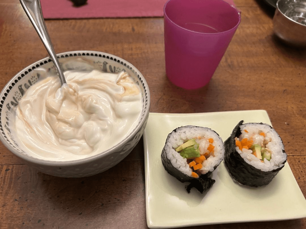 Oh my, so delicious! Sushi rolls, egg muffins, quiche with a millet and quinoa crust, arugula pizza, roasted squash, berries on my perennial favorite Greek yogurt, and more!