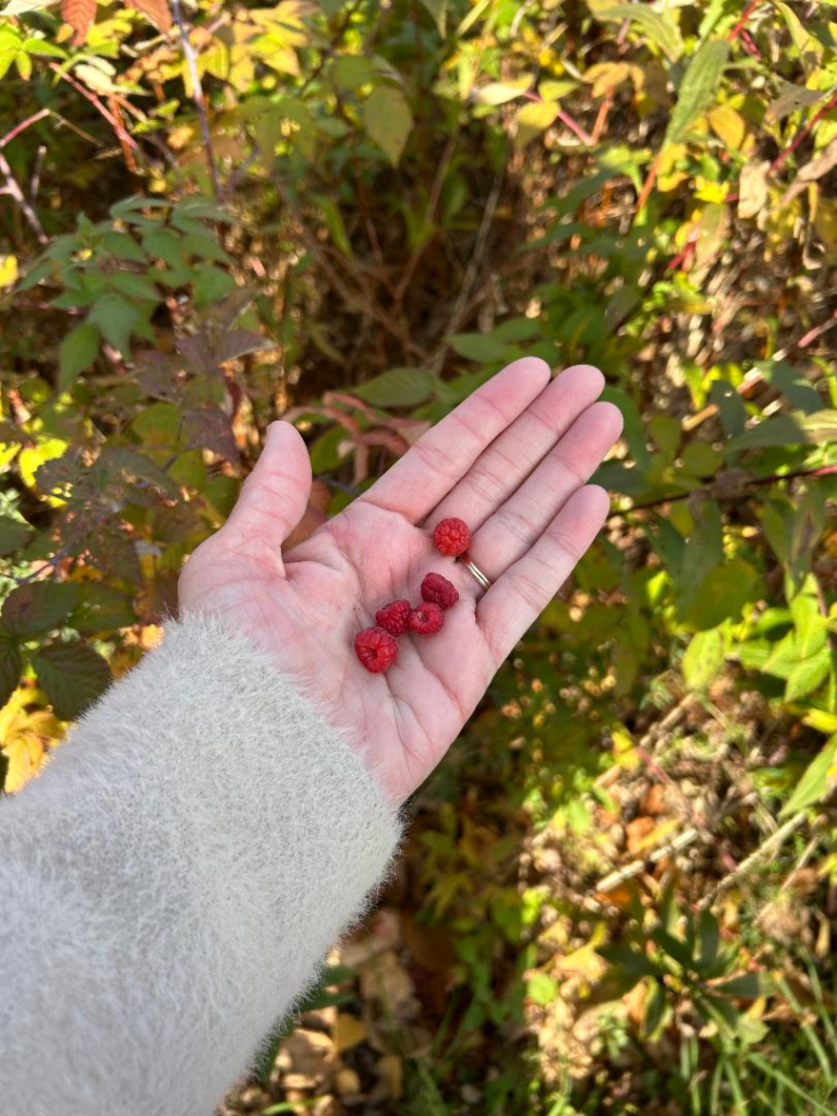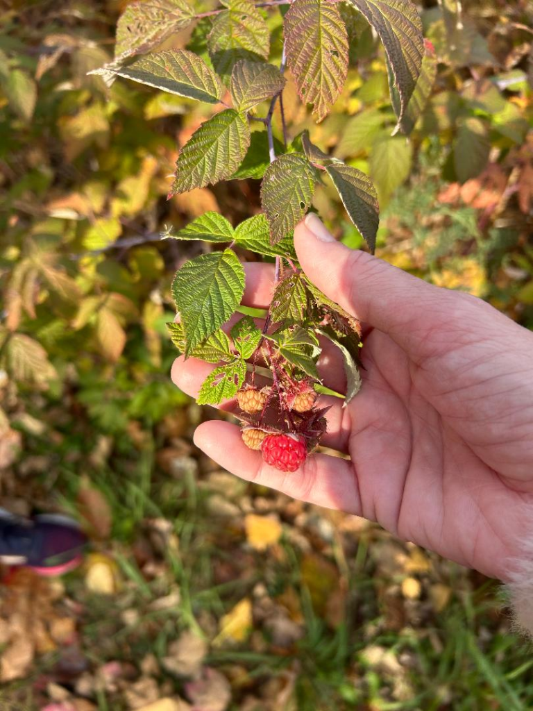 -leaves. Em said that the peak of Maine’s gorgeous fall foliage is mid-October. So we missed the peak but there were still a ton of autumn leaves on the trees to give us a visual feast, if not the peak mid-October visual orgy. We also found wild raspberries still hanging from some bushes in her neighborhood! She hadn’t had a frost yet.