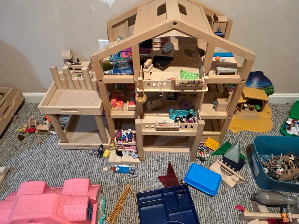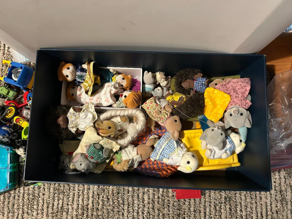 -seeing the toys of my two younger nieces in their play space in the basement. They have created a whole world out of Calico Critters, Play Mobil figures, a dollhouse, blocks, Legos, and other tiny toys. The older one, 14, has pretty much left this world of pretend, but the younger one, 11, still loves to immerse herself in this imaginative world. Ahh, so sweet! It makes me look forward to having granddaughters. With five sons and two daughters, not much estrogen flowed in our home to attract dollhouses, woodland creatures, and tiny people. We did have some Polly Pockets, Lego mini-figs, Duplo sets, and Fisher Price Little People sets. That was the extent of our miniature worlds. We never had play that looked like this.