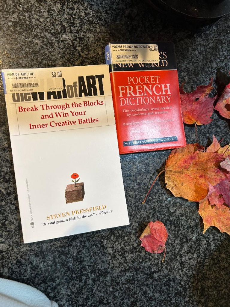 Em stayed in the books section the whole time, not put off by the high prices like I was. Our girls asked me where she was and I told them she was in the books, the last time I saw her. They went to find her and couldn’t, because she had bent over and was looking on the lower part of the shelves. It was just funny that they missed her. She was searching thoroughly! Her hard work paid off. Here are the great books she found above. She got the War of Art (get it? a play on the classic Art of War) for her BYU-attending son who is following in her footsteps and studying art there. (Although she studied illustration and he’s doing animation.) She got the pocket dictionary for her daughter, Miss M. who will be serving in a French-speaking mission in Africa.