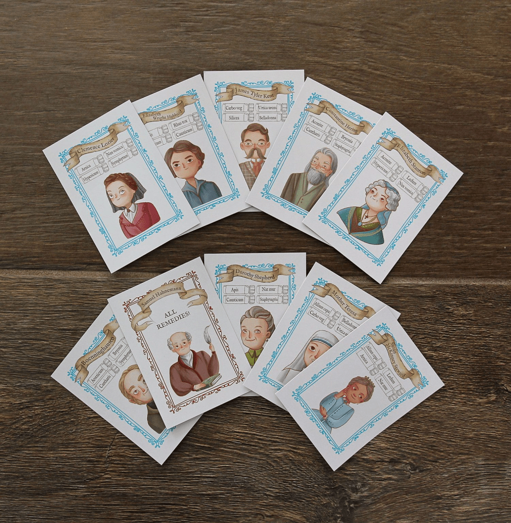 It plays similar to the game Sleeping Queens. I love the illustrations, with the objects on the box and the backs of the cards being things from nature that common homeopathic medicines are made from.