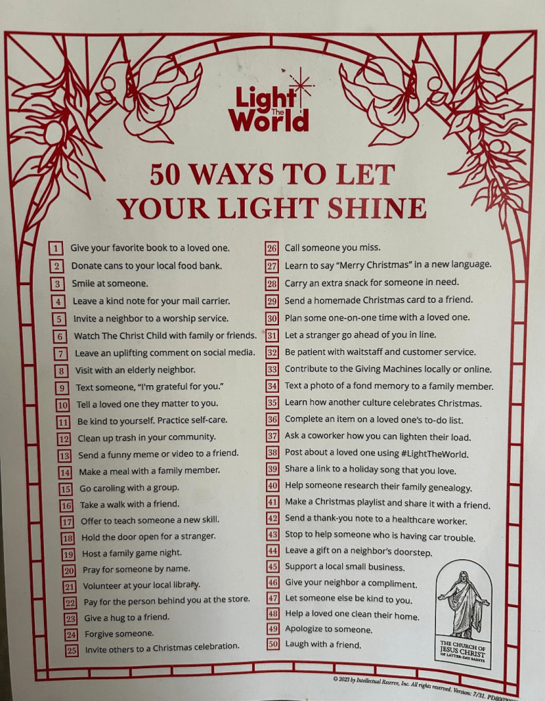 I’ve also posted this handout below on my fridge to encourage/invite/remind myself and my family members to do at least one thing each day to #lighttheworld with the light of Christ. This is part of the #lighttheworld campaign from The Church of Jesus Christ of Latter-day Saints. Giving of ourselves doesn’t have to be grand projects, it can be little acts of kindness.