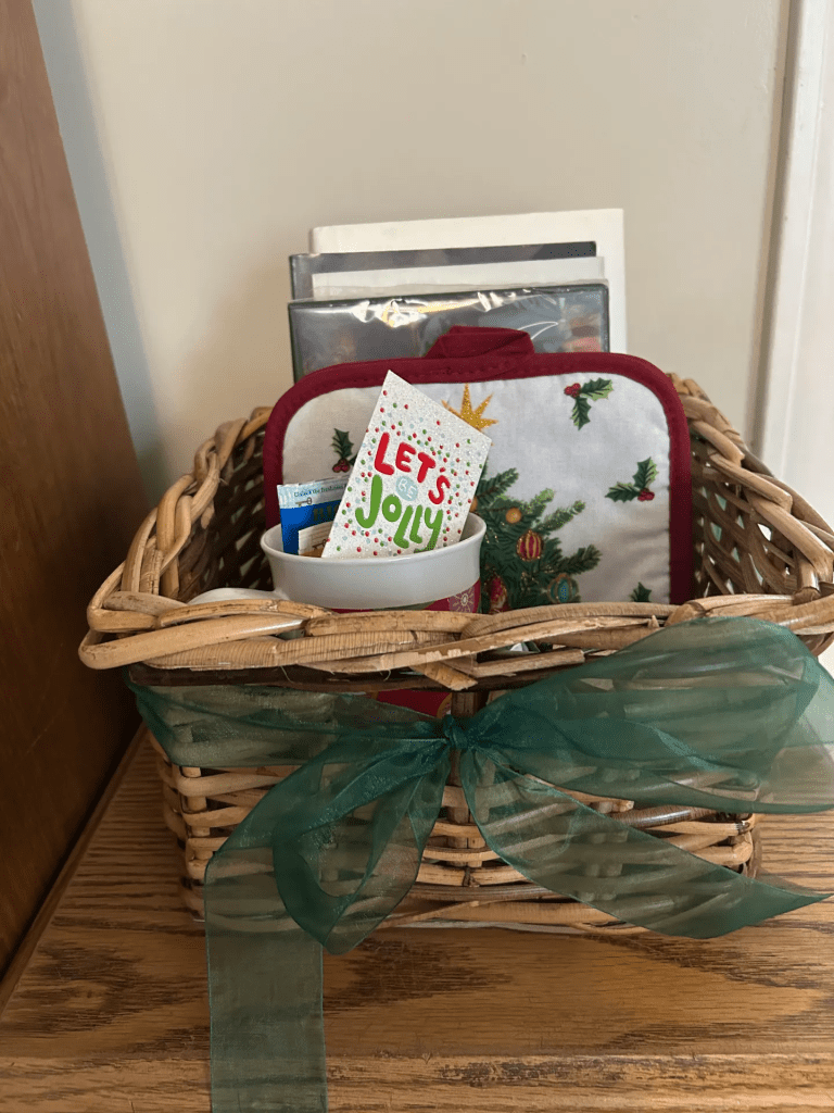 I gave the above thrifted books, DVD, and new Dollar Tree candle to a friend who just left for Nevada where she lives. I put it all in the basket below with some Dollar Tree potholders and new set of gloves. My mom’s birthday is tomorrow so I’ll be making a gift basket for her too.