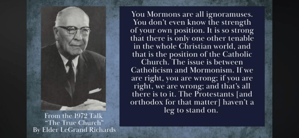 Here is the talk referred to in the image above at the very top of this post, with the picture of Elder LeGrand Richards. I had actually thought of that quote from Elder LeGrand Richards, it’s also in his book The Marvelous Work and a Wonder. I remember hearing a teenage boy tell that story with the quote in a sacrament meeting talk years ago.