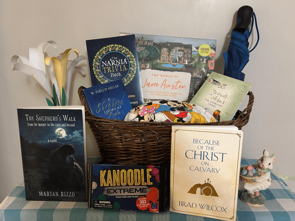 For example, the basket shown above, which would be perfect for an especially bookish teen girl, cost me $15.50 total because I found all the items thrifting! I put some some of the items in front of the basket so you can see it all, but for presentation it would all go inside. I bought everything at Deseret Industries, which is a thrift store. The five softcover books were $1 each. The Disney figures are on a T-shirt, which was $3. Then the umbrella was $2, the Kanoodle puzzle was $1.50, and the Jane Austen puzzle was $2. Amazing right? (I’m not counting the basket, or the bunny figurine. I reuse the same baskets every year, so I wouldn’t be buying a new basket, and the paper lilies and the bunny are decorations.)