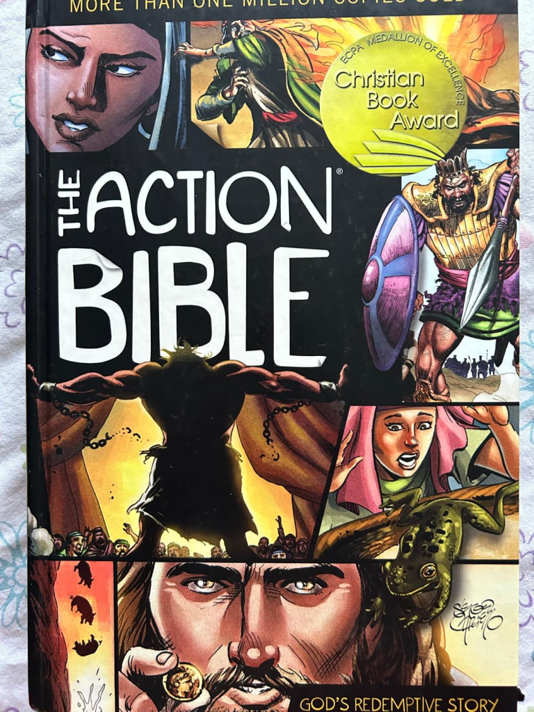 I’d do a similar basket as the one shown above for a teen boy. I’d swap out the Jane Austen puzzle for a different puzzle, like this one above, which I found thrifting for $2 and gave to my husband for his birthday last month. I’d take out the pretty green Words of Jesus book and replace it with the Action Bible shown below. I got it at a Savers for $5. That’s pricey but it is a thick hardcover book and currently $14 on amazon so totally worth it. Then I’d maybe get a different T-shirt, depending on my boy’s personality. I have 5 boys and I can see maybe one of my sons liking it for sure, the rest of them, I’m not sure they would like it. They would probably all wear the gray Mickey Mouse T-shirt I found thrifting last August for $3.