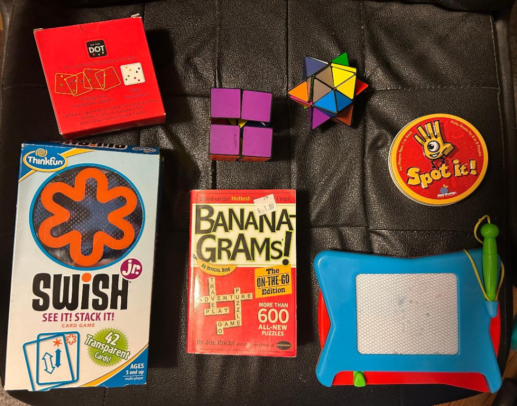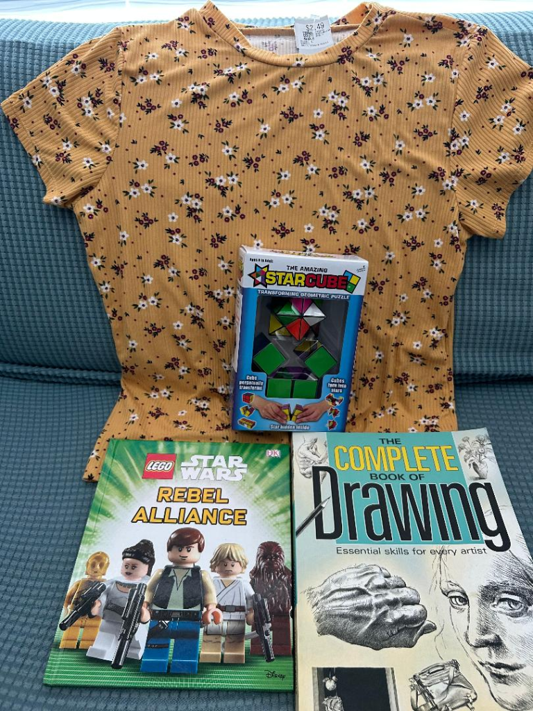 The flowery top would be fun to give to a daughter who likes to wear flowers. One of mine does and one doesn’t. The Star Cube was pricey, $6, but it was brand new in the box at Savers and I knew it would be a hit and it was. Everything else in these photos was $5 or less.