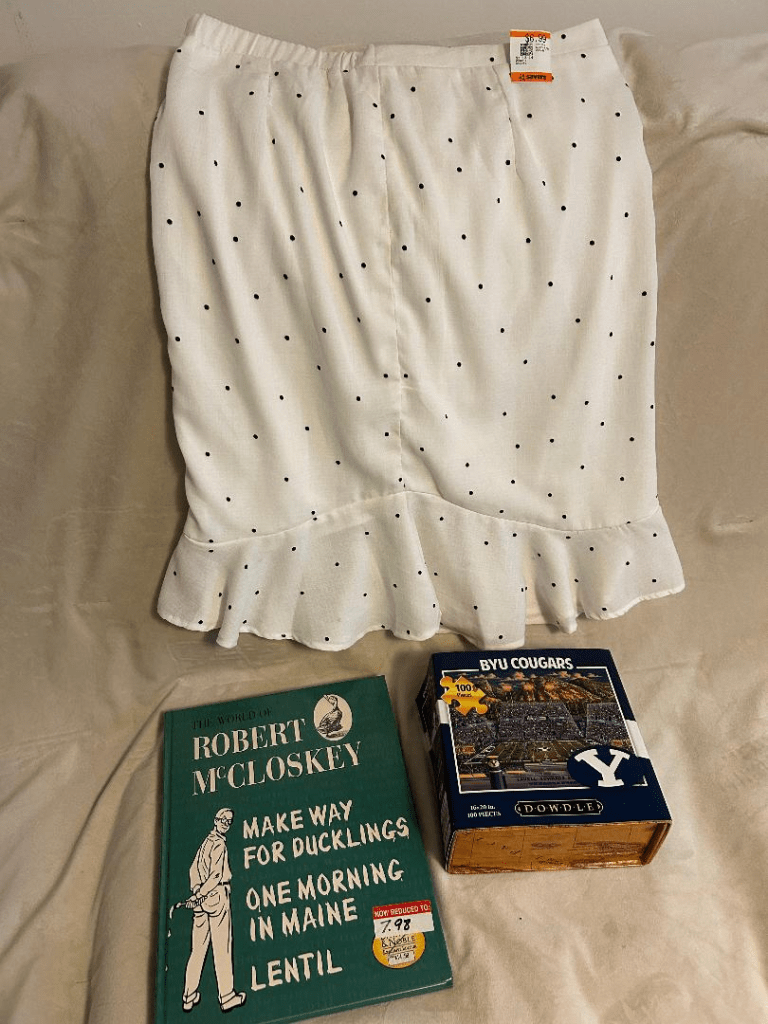 If I could rewind the clock I would give the polka dotted skirt shown above to my oldest daughter when she was a teen and the BYU puzzle to my oldest who followed BYU football. The Robert McCloskey book was $4 not $7.98 like the sticker says. I’d put it in a family Easter basket, more on that below. Just because it contains the classic duckling story.