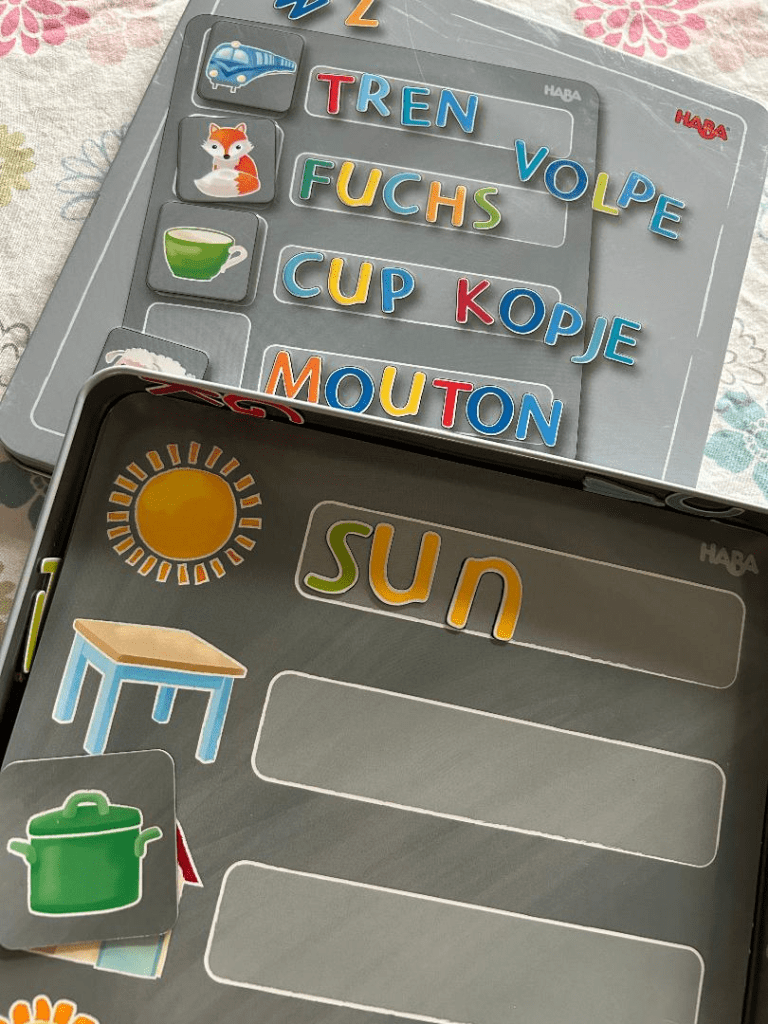 I picked this magnetic set from HABA for $2 at a thrift store last month. You take the magnetic letters and make words that go with the pictures. It would be a fun Easter gift for an emergent reader/speller. (HABA is a German company so the words shown on the lid are German but you can definitely spell English words with this set as well.) I’m excited to play with it with my grandsons the next time they come over!