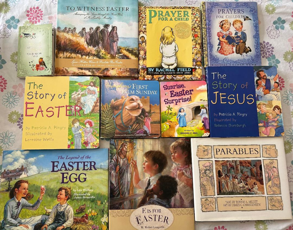 Or a spring-time themed book, like Peter Rabbit. Or something nature-themed. Little Golden Books are often at thrift stores, and they usually cost me 50 cents to $1. The ones below are more particularly spring/Jesus/God/Hero Quest-themed.