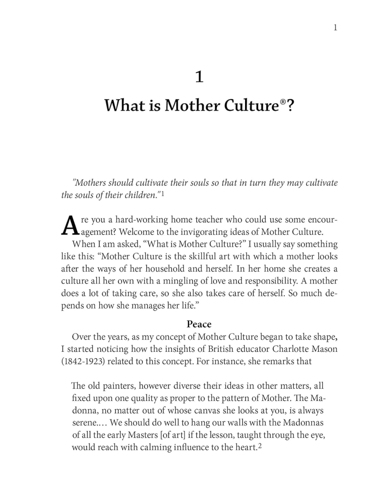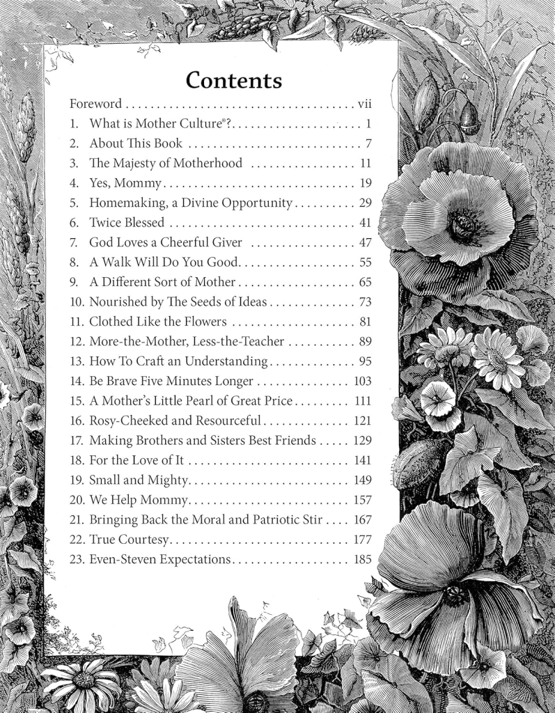 Mother’s Day is less than two weeks away! To celebrate I’m blogging about a wonderful book that is geared towards mothers, especially homeschooling moms. It’s Mother Culture by veteran homeschooling mom Karen Andreola. I’m also doing a giveaway of this book. To enter into the random drawing for the giveaway, please comment in the comments section at the bottom of this post. I will announce the winner on Monday June 1, 2026 around noon. When you make your comment, please include your name and what chapter in the book you are most interested in learning, as shown below in the two images featuring the Table of Contents.