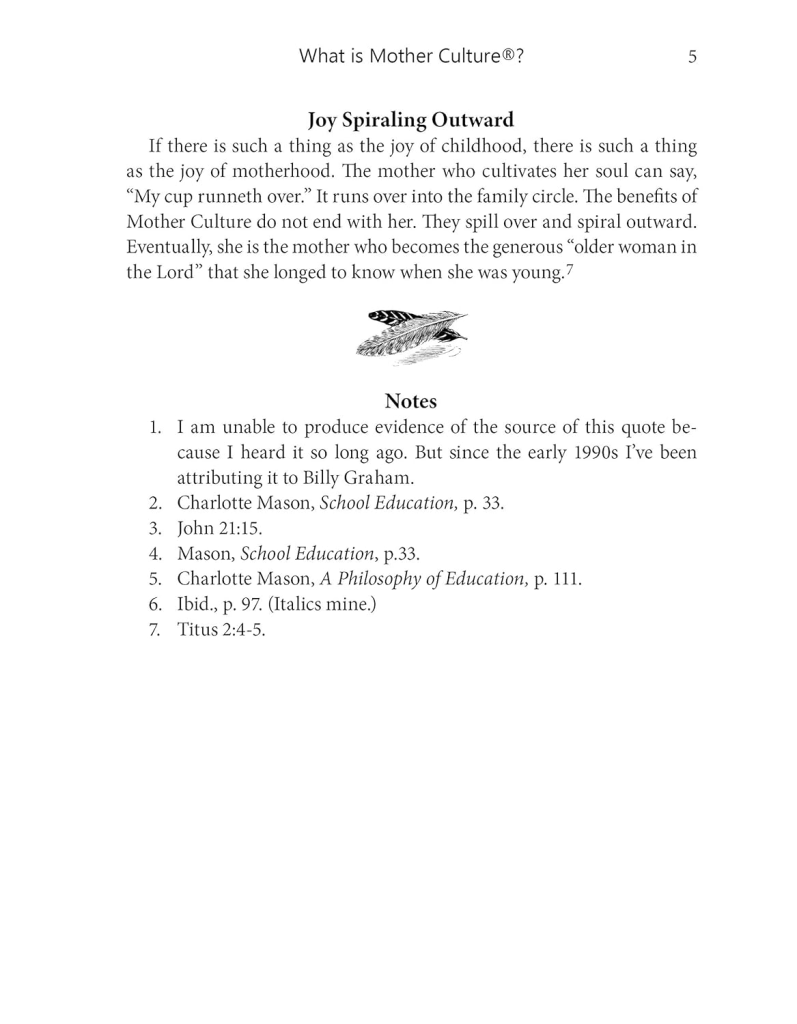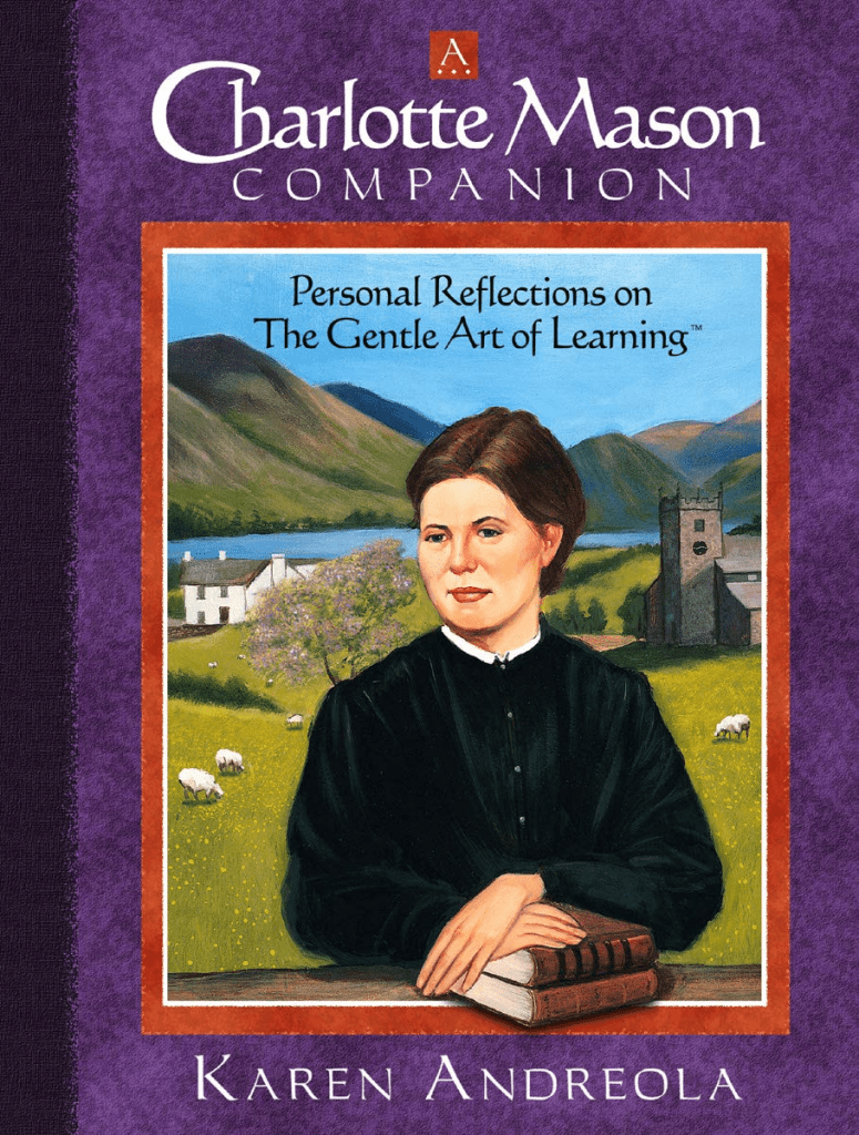 I was delighted a few years ago to find out that Mrs. Andreola has continued to be a voice in the homeschool world, since my early days of homeschooling in the late 1990s. I bought her first book, A Charlotte Mason Companion, when my oldest was 5, in 1998. Mrs. Andreola continues to write to spread the good news of Charlotte Mason. Astute observers will notice that this book, as shown below, is featured as the top book in the pile to the left of the mother’s elbow on the cover of the Mother Culture book, shown at the top of this post. Mrs. Andreola’s son, Nigel Andreola, is the illustrator. How fun!