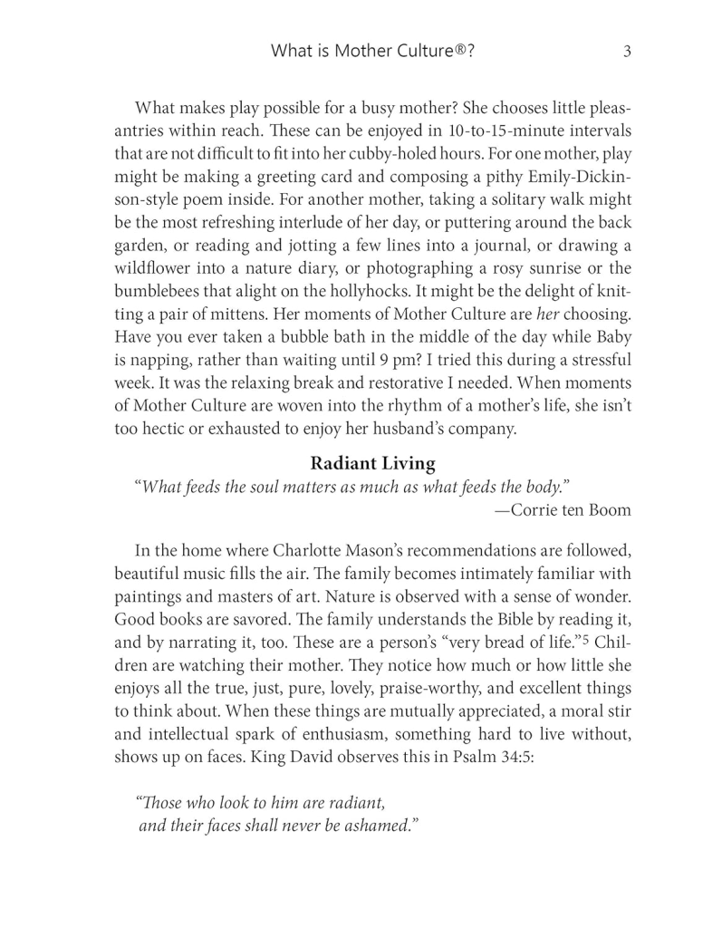 ACMC was my first “how to homeschool book” that I ever bought, and I still have it. That book is a primer for parents on how to homeschool the Charlotte Mason way. I view Mother Culture as a companion to that book, maybe a sequel? It shows mothers how to nurture their souls so they can better nurture their children, by using the Charlotte Mason method. I learned so much from the ACMC: knowing the difference between living books vs. twaddle, the power of reading living books aloud, the power of narration, the value of short lessons, the value of getting your child outside into nature, and the importance of establishing good habits for children, among other truths. Charlotte Mason’s idea that good habits are like railroad tracks that give your child a solid foundation to life was in my mind and heart a lot when I was in the thick of mothering my seven children. It helped me to persevere in helping them form good habits. (I’m now at the end of homeschooling, with only my youngest child in the nest.) One of my first homeschooling conferences was in the fall of 1999 that featured a Charlotte Mason expert (Not Karen Andreola). I attended it with my husband and two other couples who are still great friends. We had so much fun that day, such that I have happy memories from that conference. I also joined a Charlotte Mason email support group and felt blessed to have all that guidance. Even though I haven’t been strict about using the Charlotte Mason method as in, I haven’t used the Ambleside Online curriculum or been a faithful nature journaler, I have benefitted much from the CM philosophy. That means I have used the aforementioned truths to guide my homeschooling. So to find this “new,” at least new-to-me book by Mrs. Andreola is such a delight!
