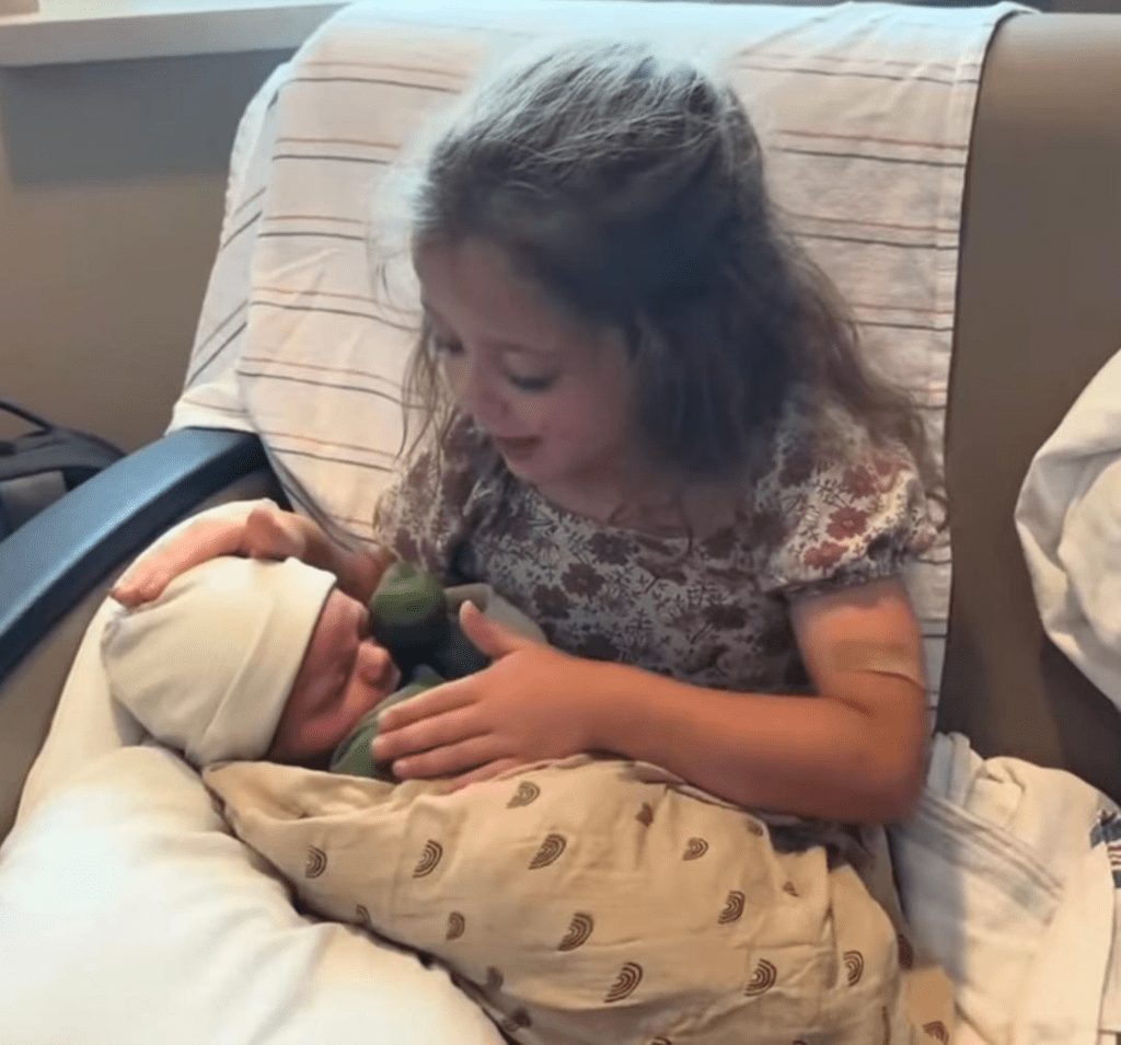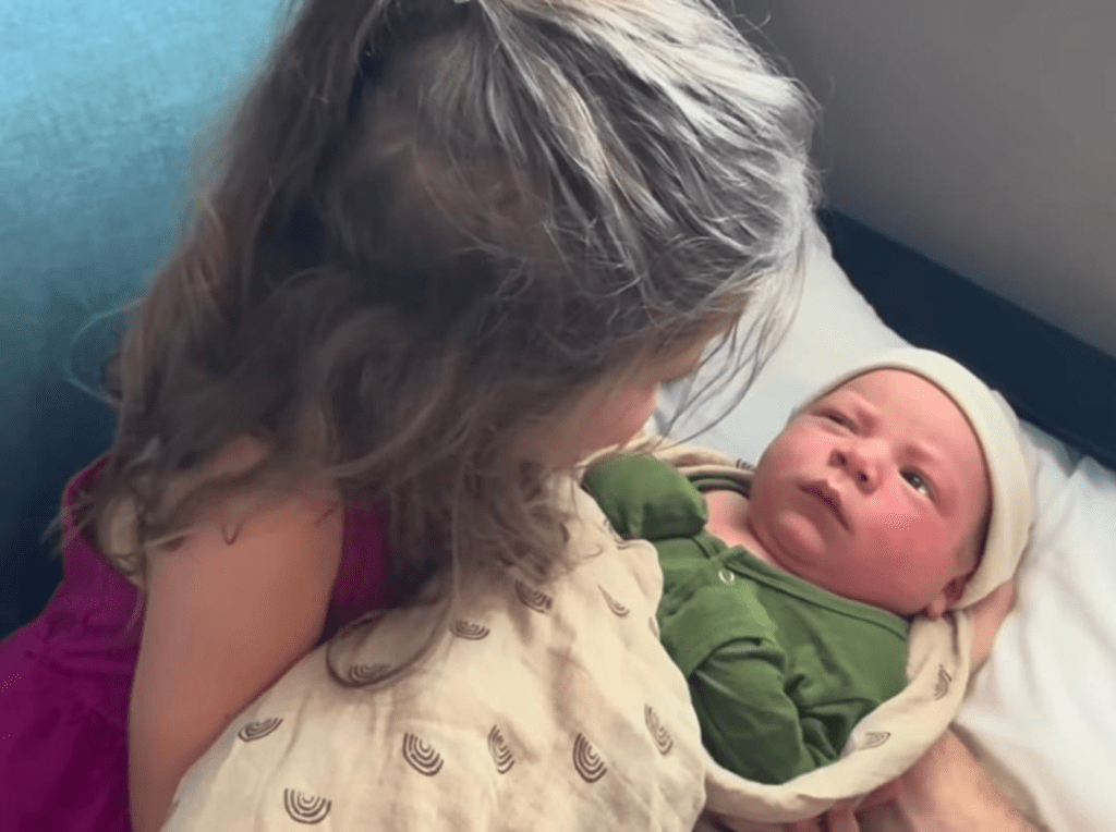 Here’s big sister Fern holding the baby. She says they should name the baby “Rainbow Print” and then Ivy suggests “Bunny.” So funny! Ben and Jessa say that they haven’t decided the name yet. I relate. With one of my babies, actually it was also Baby #6 for me, DH and I didn’t come up with a name until six weeks had passed!